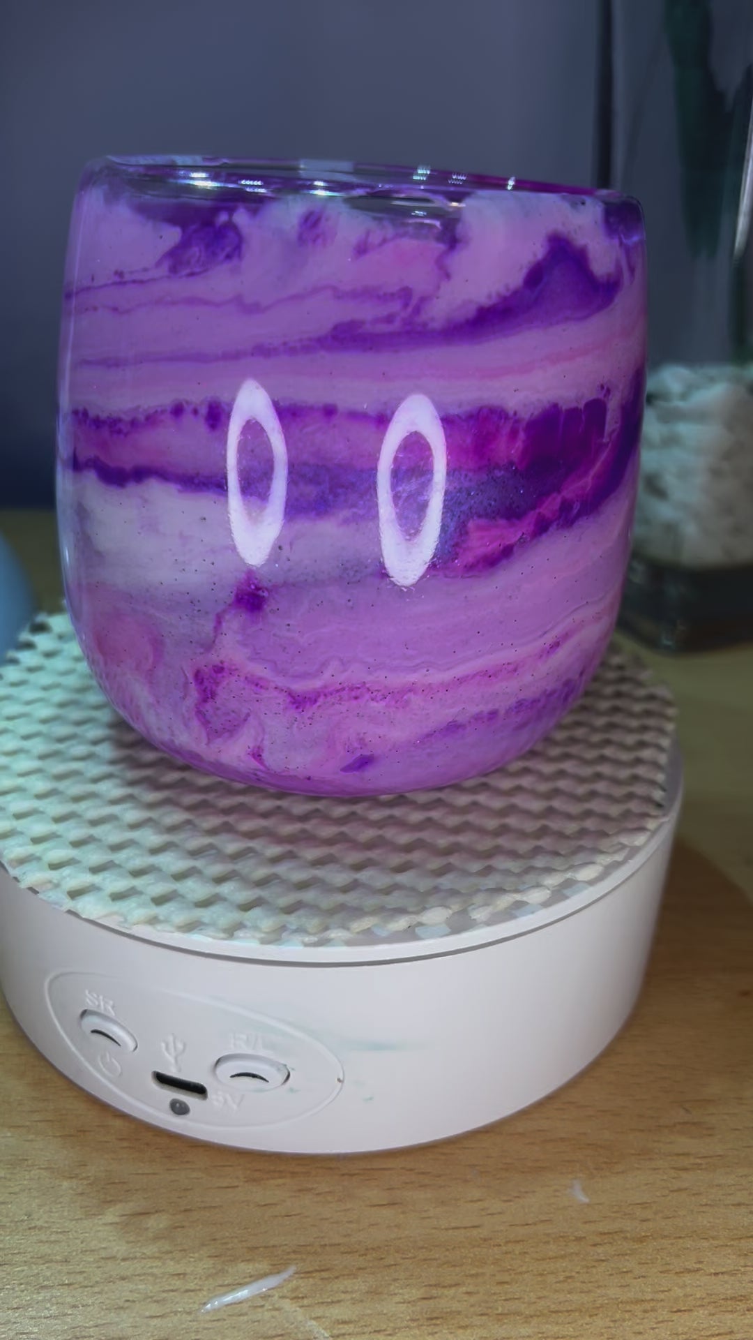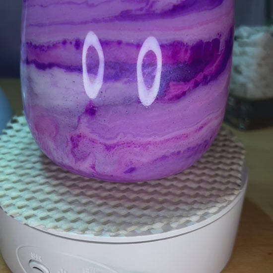 Double wall glass cup with resin and pinks and purples ink swirls