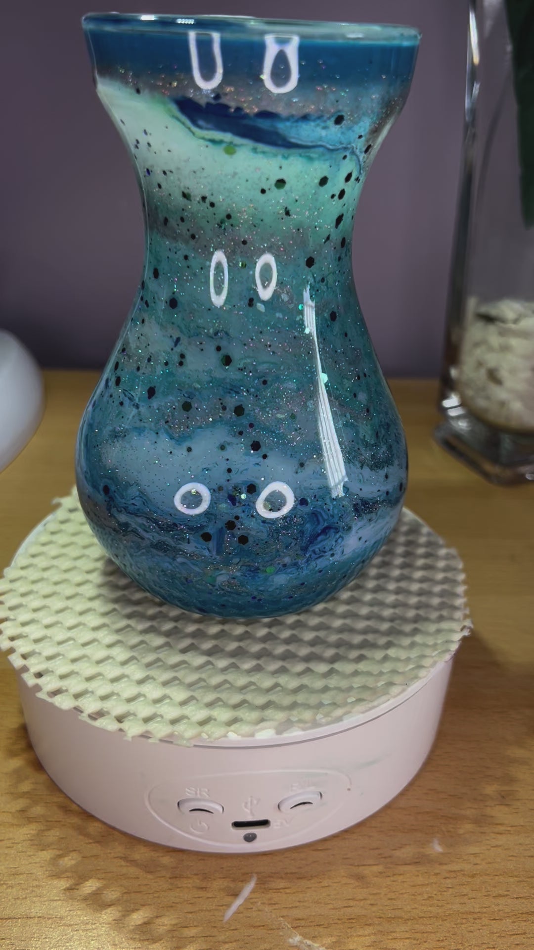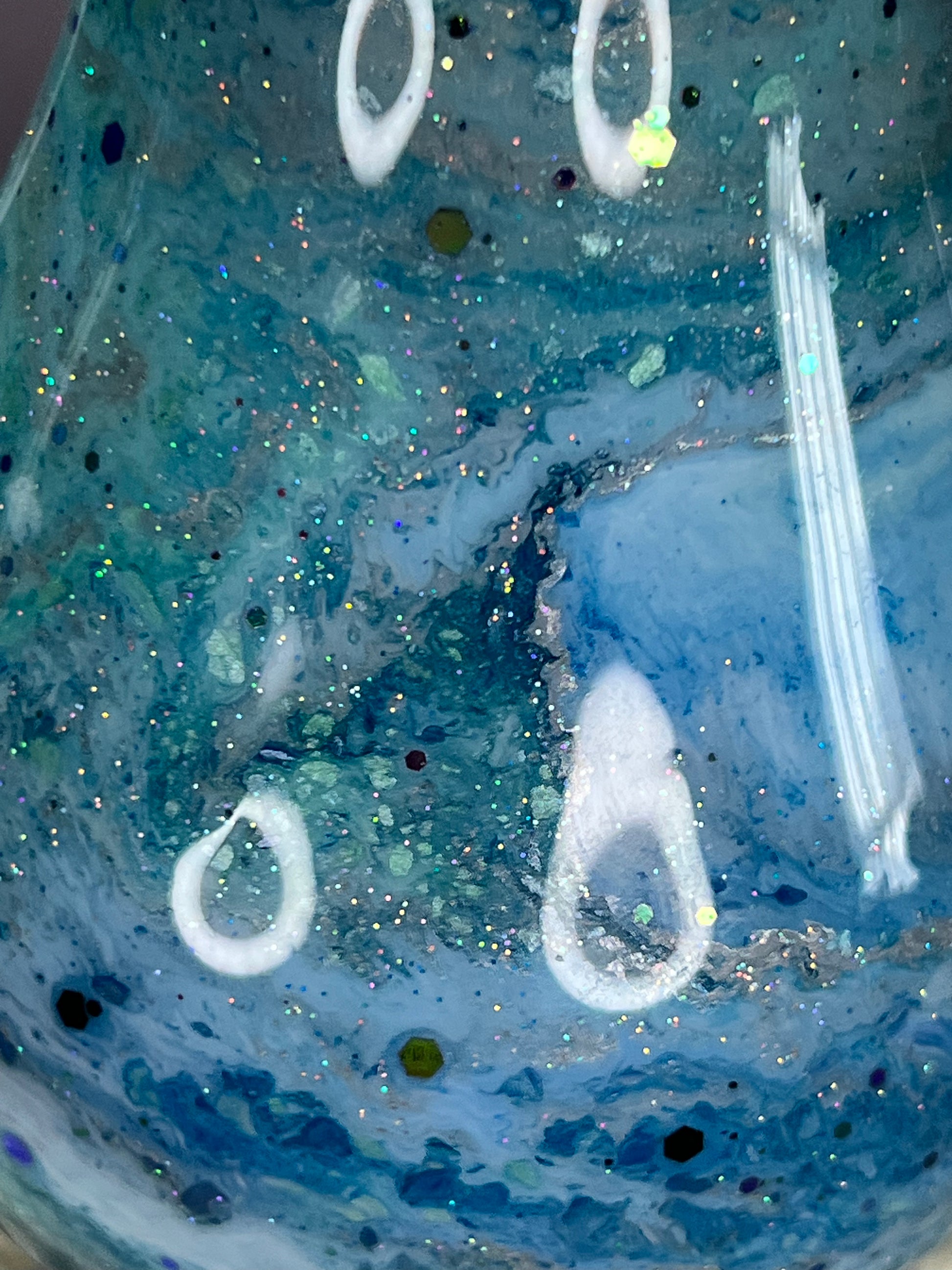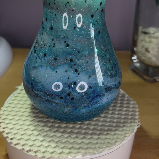 Mini glass vase with inks and mica powder swirled in with epxoy resin in blues, turquoises and white with glitter for added sparkle